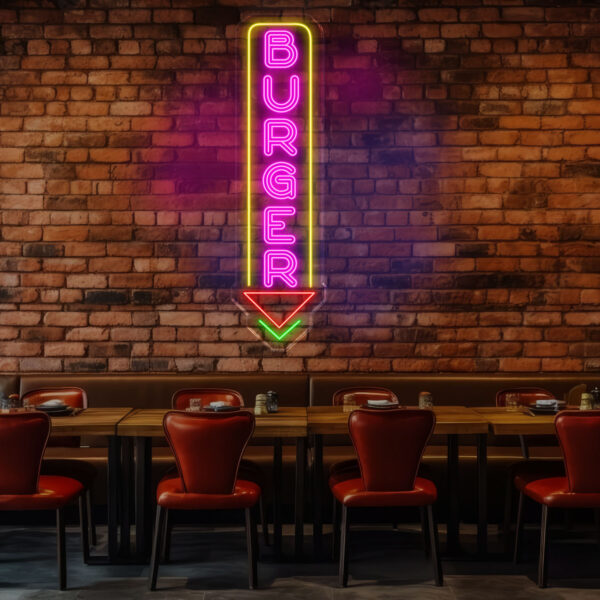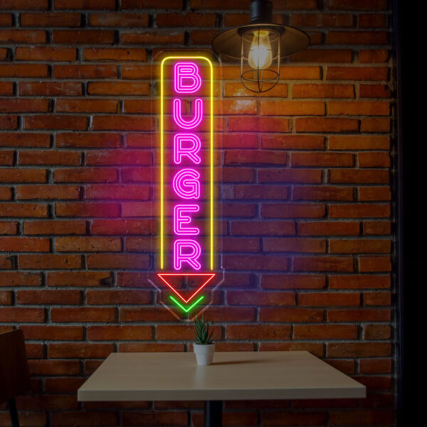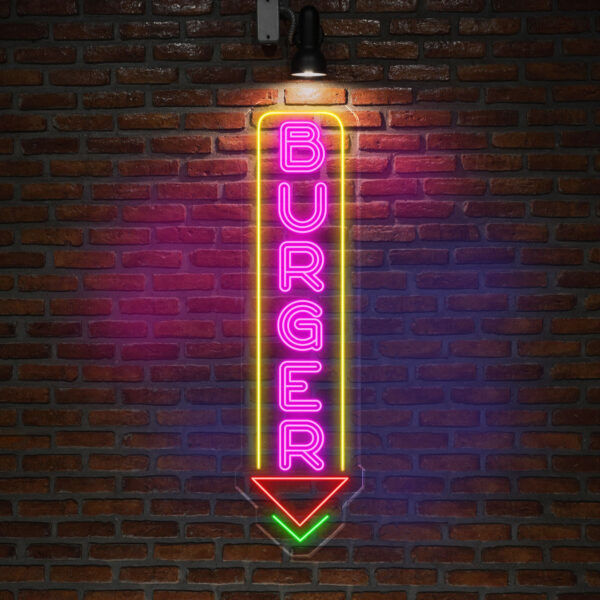 Burger LED Neon Sign, Custom Fast Food Restaurant Light, Vertical Burger Shop Wall Neon Decor